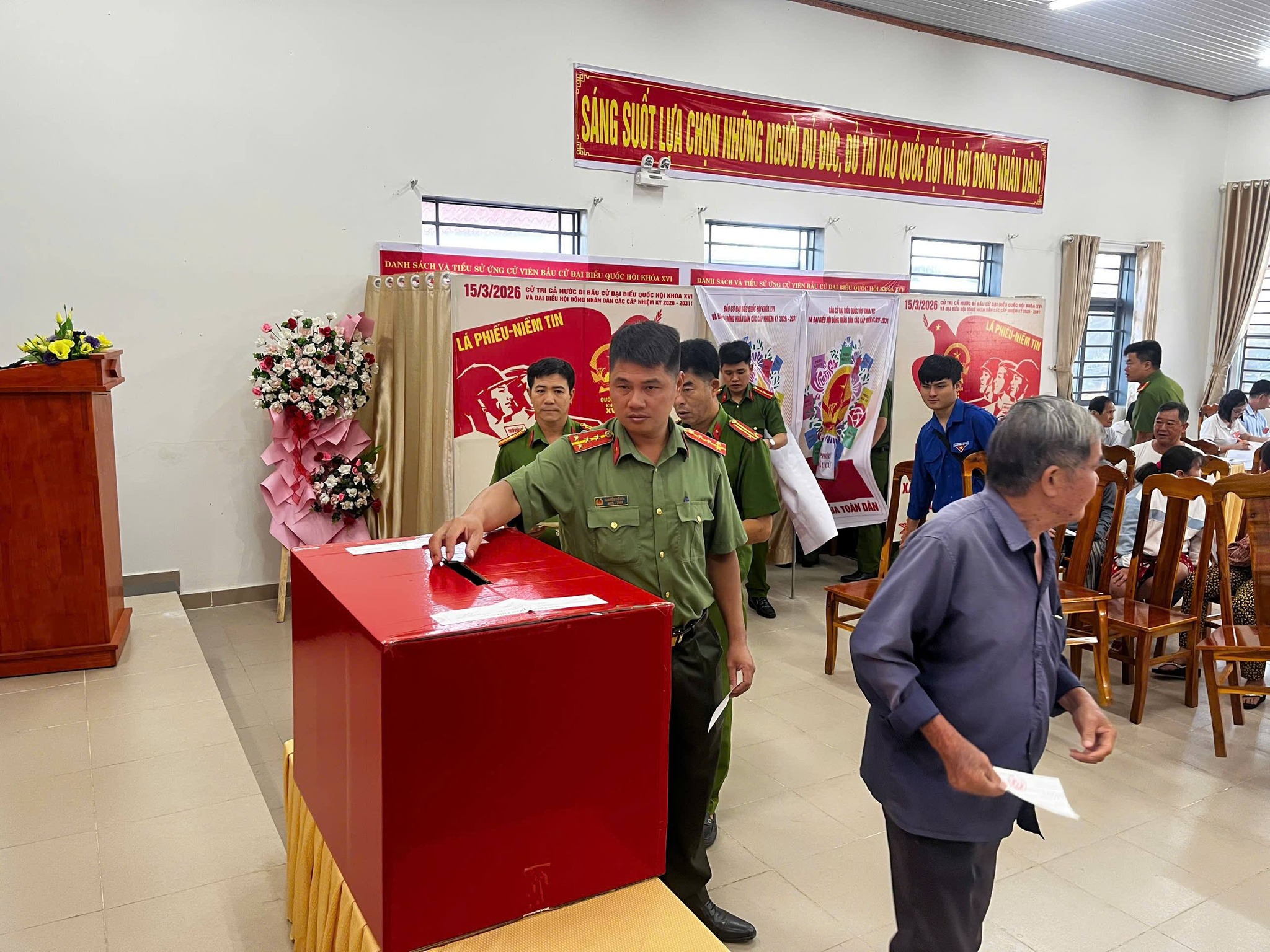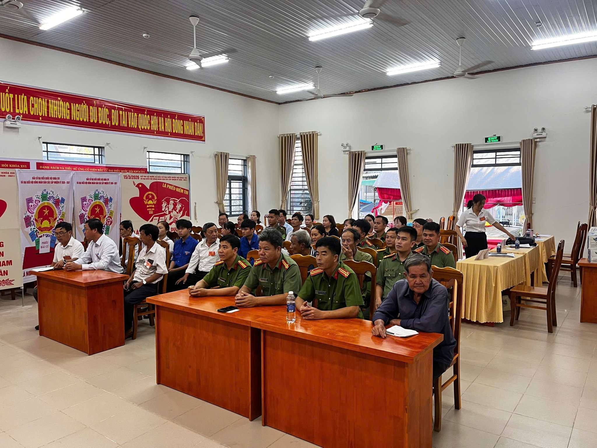 - Khu vực bỏ phiếu số 14, địa điểm Hội trường Công an xã có Đồng chí Trần Quang Thuần, Đảng ủy viên, Phó ban Xây dựng Đảng và Đồng chí Lê Thị Tuyến, Phụ trách trạm Y tế xã.