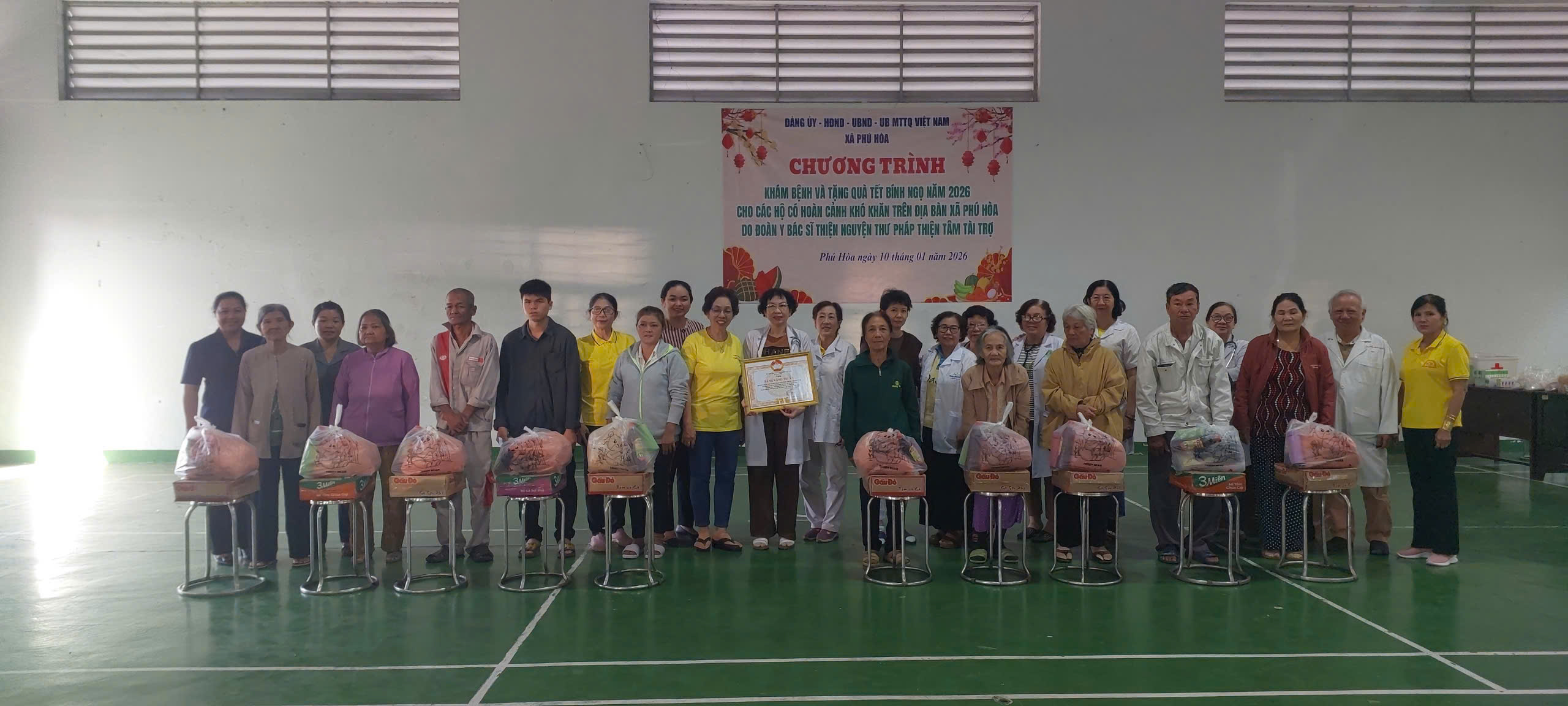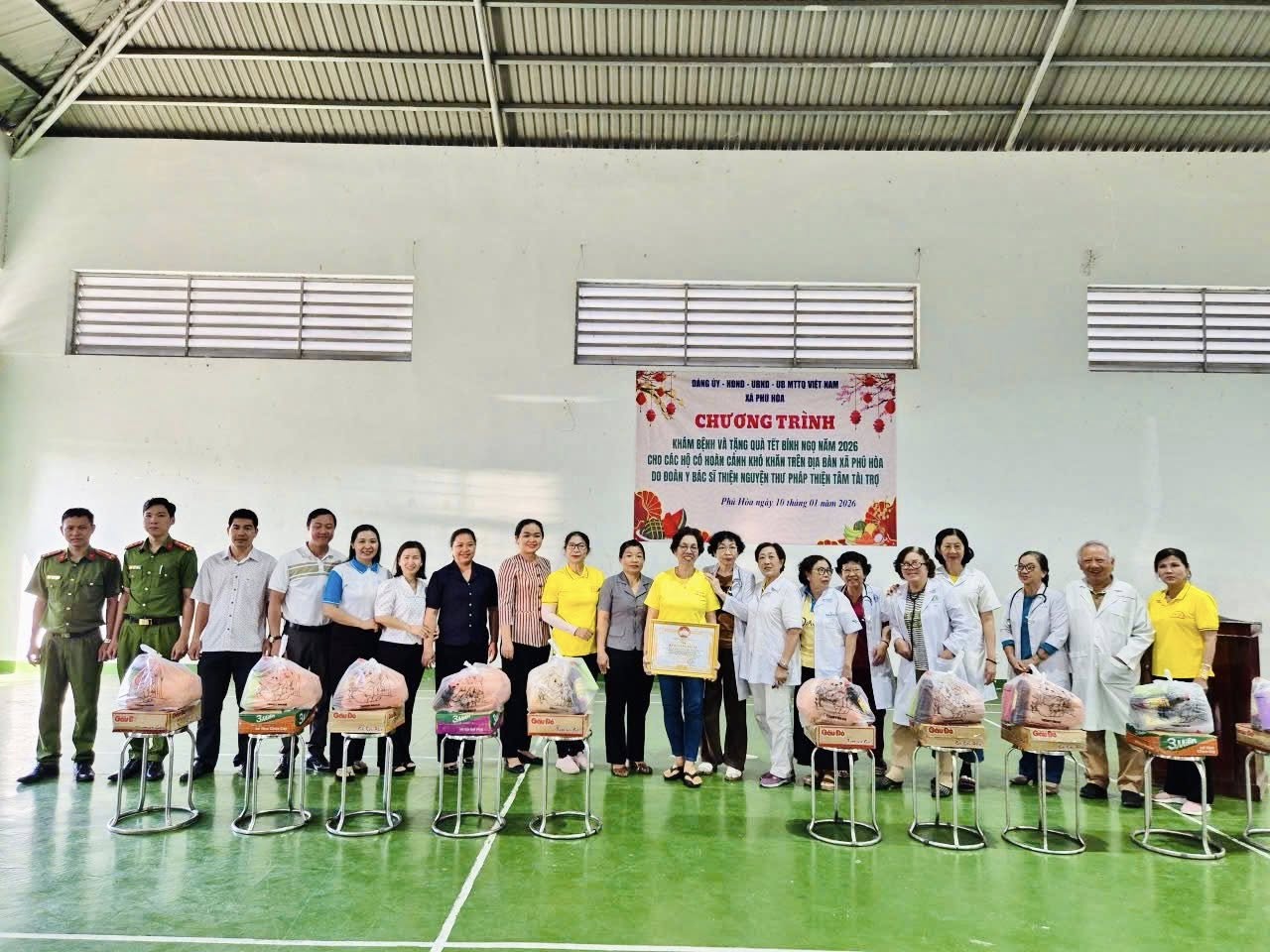 Sáng ngày 10/01/2025, hòa trong không khí vui tươi, ấm áp nghĩa tình, Đảng  ủy - HĐND – UBND - UB.MTTQ VN xã Phú Hòa vui mừng, phấn khởi khi được  Đoàn y, bác sỹ thiện nguyện thư pháp Thiện Tâm về tổ chức chương trình khám bệnh và tặng quà Tết Bính Ngọ năm 2026 cho các hộ có hoàn cảnh khó khăn trên địa bàn xã tại Trung tâm văn hóa thể thao - Học tập cộng đồng xã Phú Hòa.