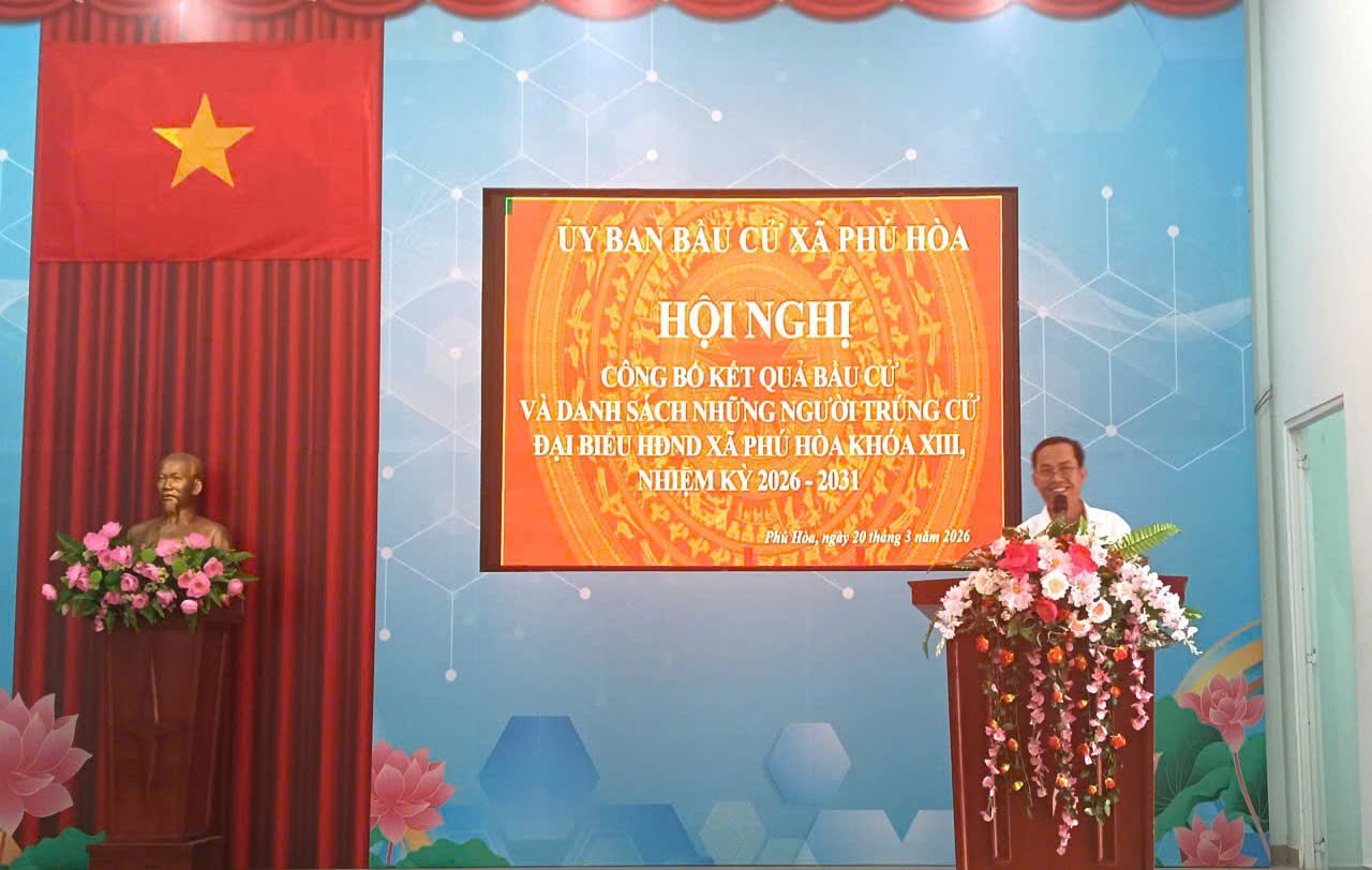 Chiều ngày 20/3/2026, Ủy ban Bầu cử xã Phú Hòa đã tổ chức Hội nghị công bố kết quả bầu cử và danh sách những người trúng cử đại biểu HĐND xã khóa XIII, nhiệm kỳ 2026–2031 tại Trung tâm VTTT-HTCĐ Phú Lợi.