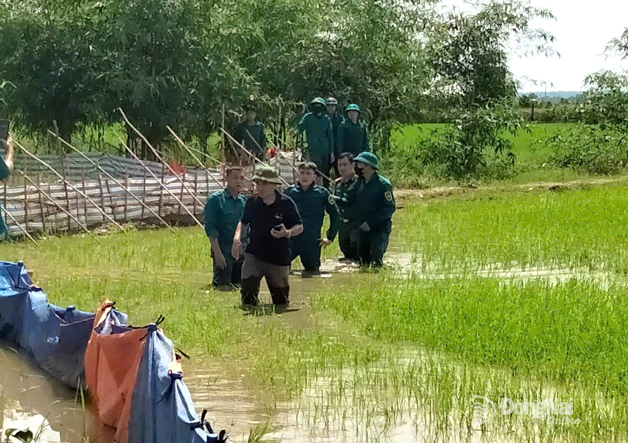 Ông Nguyễn Văn Viện và cán bộ xã Phú Hòa kiểm tra, xử lý ngập lụt trong đợt mưa lũ vừa qua tại địa phương. Ảnh: Lê Trung