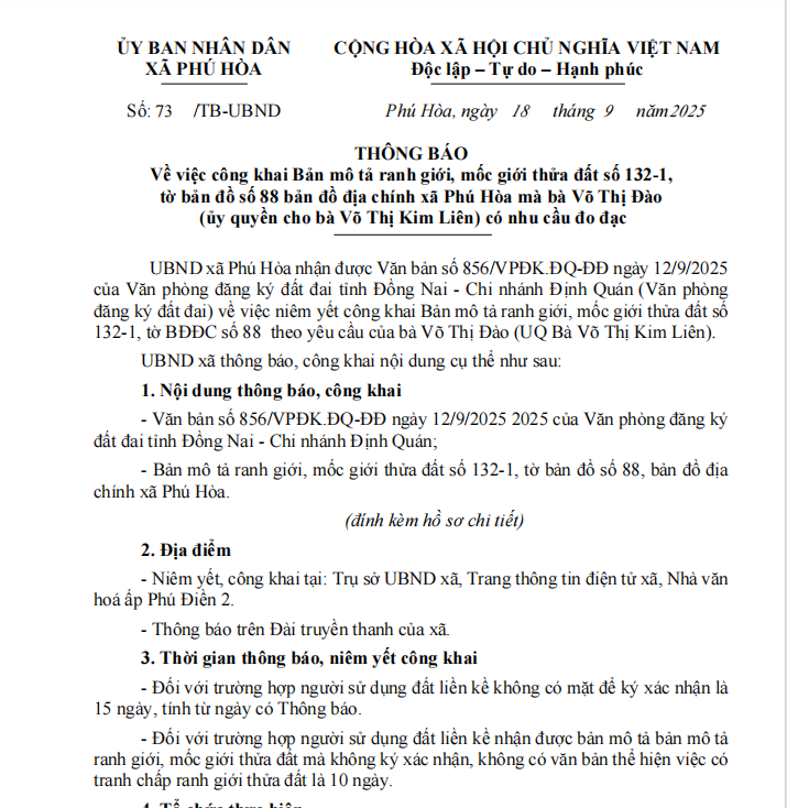 Thông báo số 73/TB-UBND ngày 18 tháng 9 năm 2025 về việc công khai Bản mô tả ranh giới, mốc giới thửa đất số 132-1, tờ bản đồ số 88 bản đồ địa chính xã Phú Hòa mà bà Võ Thị Đào (ủy quyền cho bà Võ Thị Kim Liên) có nhu cầu đo đạc.