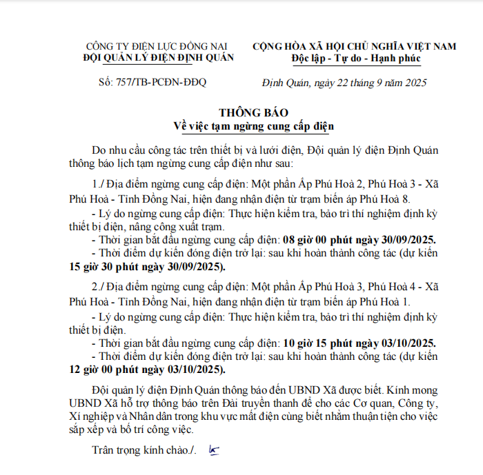 - Thời gian bắt đầu ngừng cung cấp điện: 08 giờ 00 phút ngày 30/09/2025.