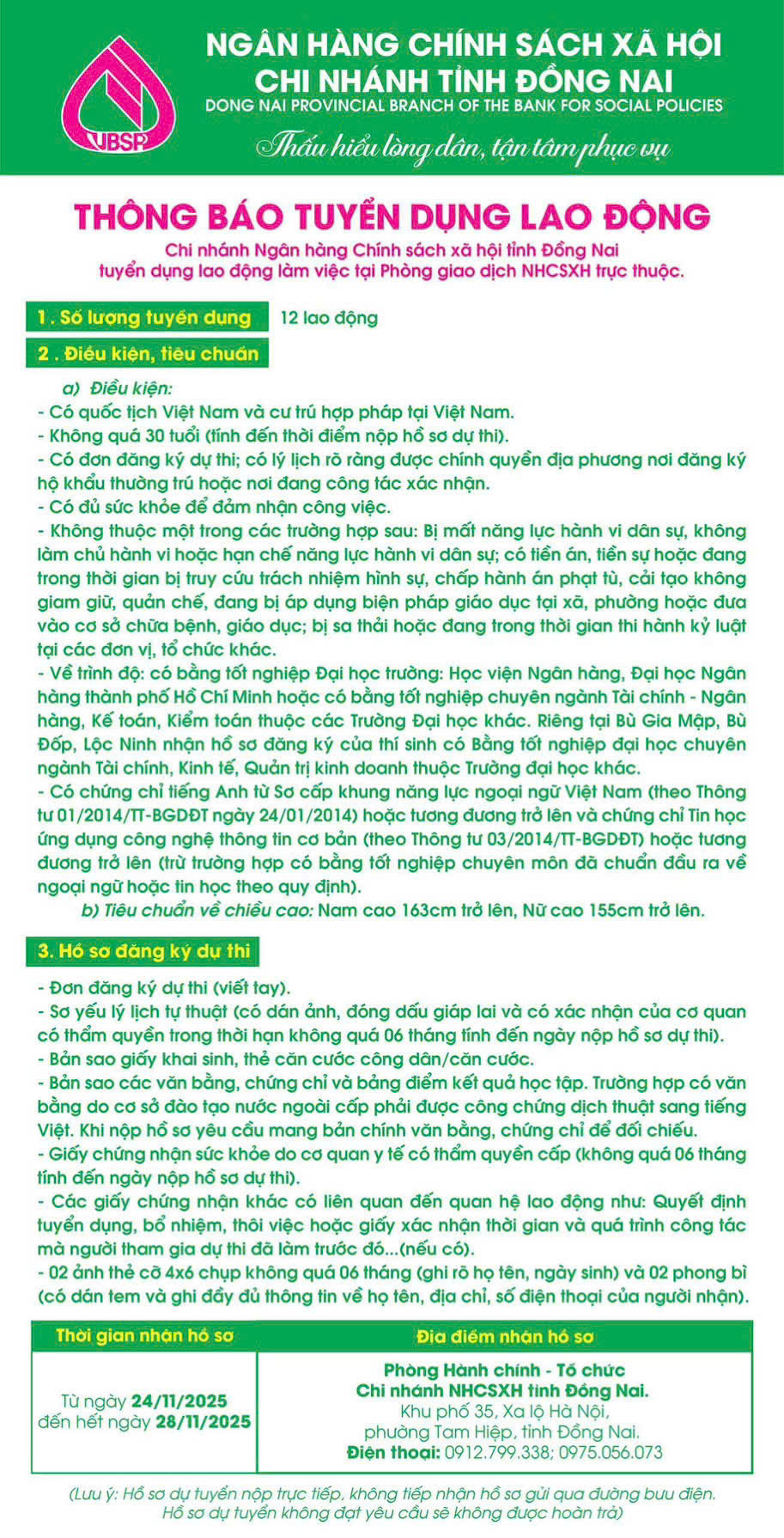 Chi nhánh Ngân hàng Chính sách xã hội tỉnh Đồng Nai thông báo tuyển dụng lao động làm việc tại Phòng giao dịch NHCSXH trực thuộc