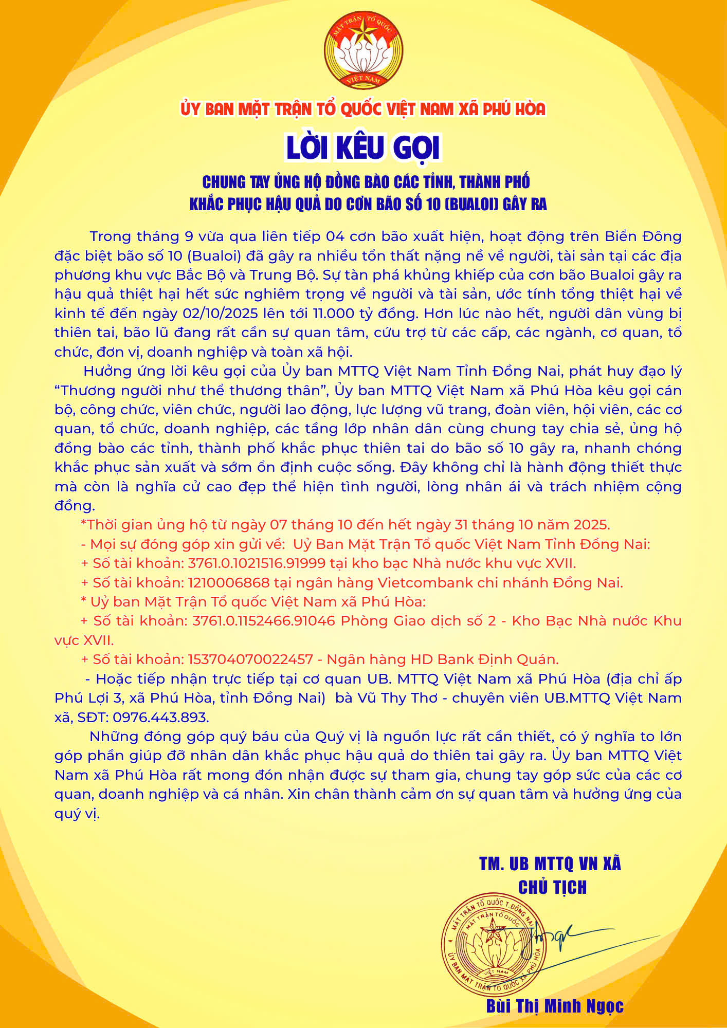 Hưởng ứng lời kêu gọi của Uỷ ban MTTQ Việt Nam Tỉnh Đồng Nai, phát huy đạo lý "Thương người như thể thương thân", Uỷ ban MTTQ Việt Nam xã Phú Hòa kêu gọi cán bộ, công chức, viên chức, người lao động, lực lượng vũ trang, đoàn viên, hội viên các cơ quan, tổ chức, doanh nghiệp, các tầng lớp nhân dân cùng chung tay chia sẻ, ủng hộ đồng bào các tỉnh, thành phố khắc phục thiên tai do bão số 10 gây ra, nhanh chóng khắc phục sản xuất và sớm ổn định cuộc sống, đây không chỉ là hành động thiết thực mà còn là nghĩa cử cao đẹp thể hiện tình người, lòng nhân ái và trách nhiệm cộng đồng.