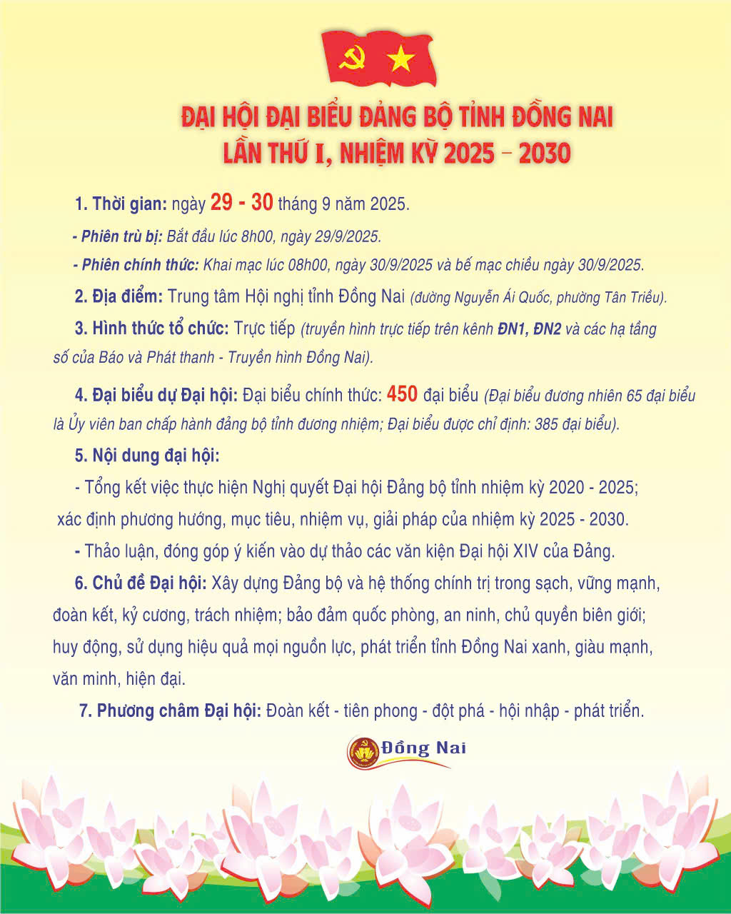 Xây dựng Đảng bộ và hệ thống chính trị trong sạch, vững mạnh, đoàn kết, kỷ cương, trách nhiệm; bảo đàm quốc phòng, an ninh, chủ quyền biện giới; huy động, sử dụng hiệu quả mọi nguồn lực phát triển tỉnh Đồng Nai xanh, giàu mạnh, văn minh, hiện đại