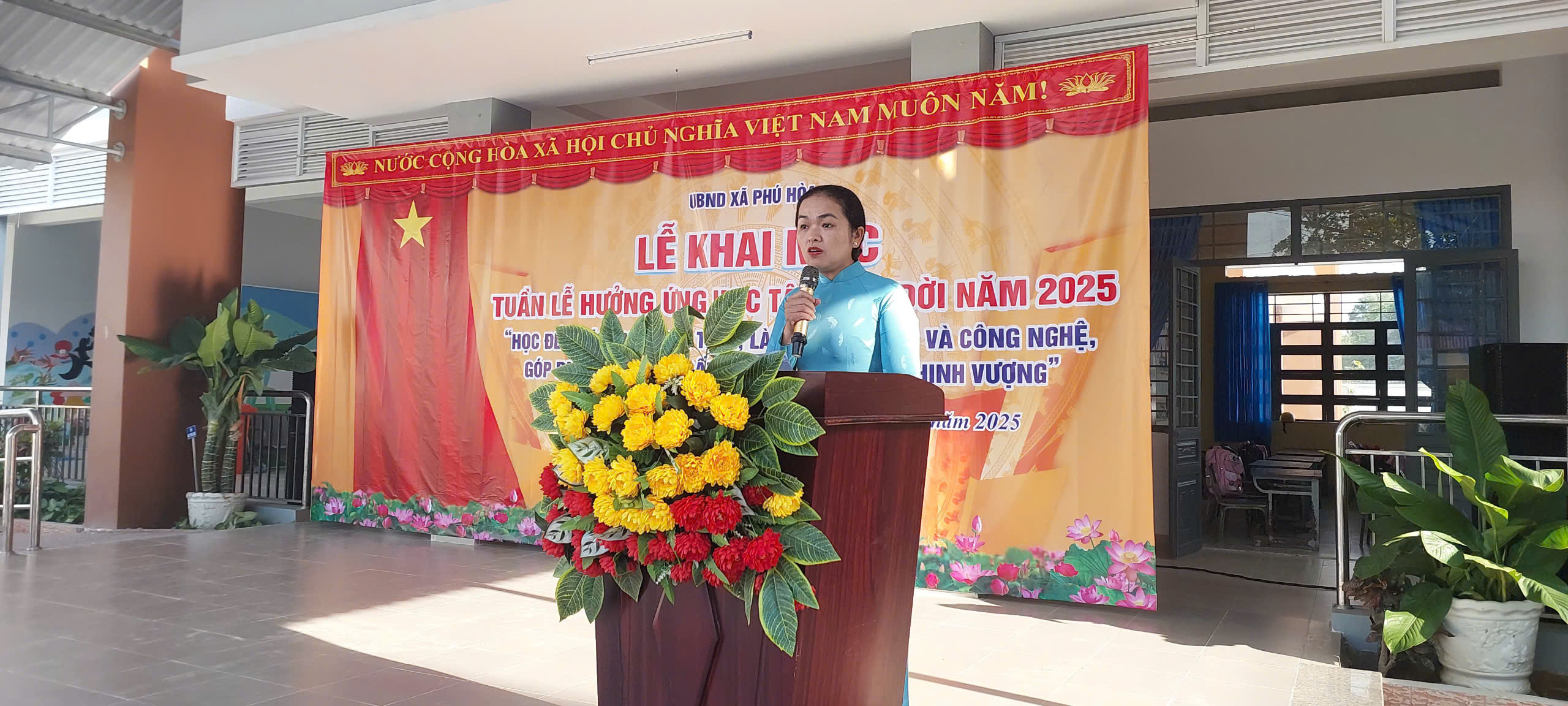 Phát biểu khai mạc buổi lễ, đồng chí Dương Thị Kim Phú, Ủy viên Thường vụ, Phó Chủ tịch UBND xã đã nhấn mạnh các nội dung trọng tâm: Học tập không chỉ dành cho học sinh mà là nhu cầu, trách nhiệm của mọi tầng lớp nhân dân, từ cán bộ, công nhân, nông dân đến người cao tuổi, trong đó đặc biệt quan trọng trong bối cảnh chuyển đổi số và xây dựng chính quyền địa phương hai cấp và các hoạt động học tập cộng đồng, xây dựng tủ sách, thư viện, phát triển văn hóa đọc, ứng dụng chuyển đổi số trong học tập được triển khai hiệu quả. Nhiều tấm gương hiếu học, vượt khó vươn lên đã trở thành động lực, nguồn cảm hứng cho toàn xã hội noi theo. Đồng thời, đề ra 4 nhóm nhiệm vụ trọng tâm cần thực hiện: “Tăng cường tuyên truyền, thực hiện các nghị quyết và chương trình về giáo dục, đặc biệt là Nghị quyết 71-NQ/TW về đột phá phát triển giáo dục – đào tạo, đẩy mạnh chuyển đổi số trong học tập. Hỗ trợ các đối tượng yếu thế, học sinh nghèo hiếu học, nhân rộng các mô hình “Gia đình học tập”, “Công dân học tập”...Đổi mới phương pháp dạy - học, khuyến khích học tập qua các nền tảng số, sách điện tử, trợ lý ảo học tập, lớp học số, phát triển kỹ năng tự học. Huy động toàn xã hội tham gia, tạo nguồn lực tổng hợp để xây dựng xã hội học tập toàn diện, bền vững”.